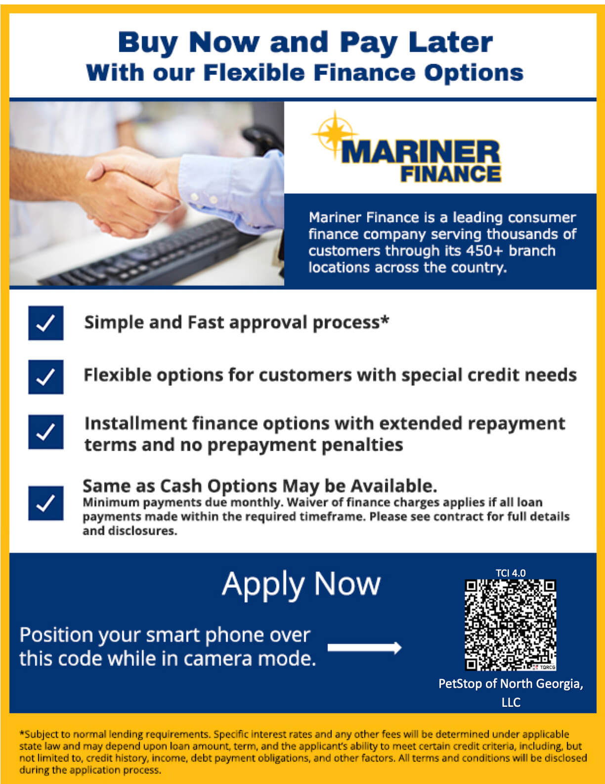 We offer world class financing through Mariner Finance financing. For all your PetStop electronic pet fencing, and Plexidor dog door needs!